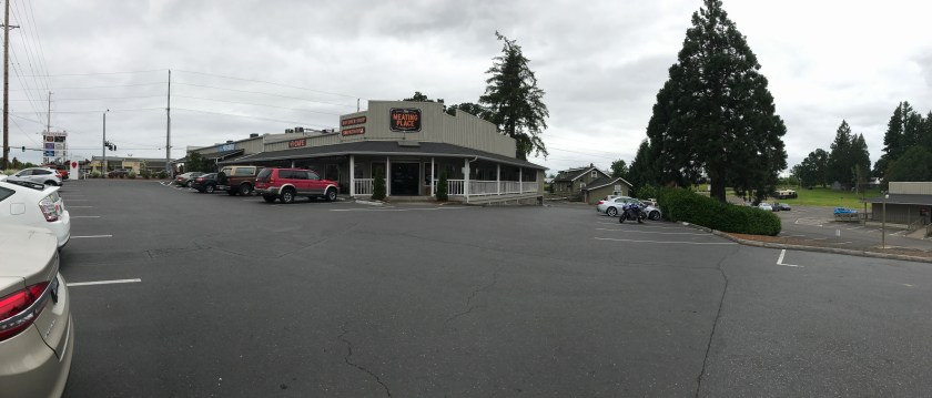 The Meating Place is toward the end of the the road on the north end of Cornelius Pass, well, the road goes on a bit further but it’s the end of most of the interesting places in Hillsboro. The signage is quite easy to see and the parking lot is fairly big, and was pretty full when I got there around eleven-thirty on Saturday. There are quite a few places to sit outside – both picnic tables and metal tables.