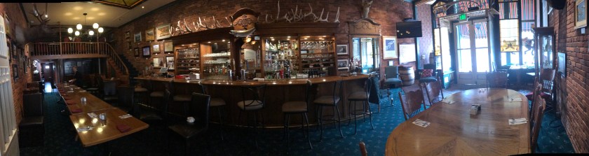 There is a portal on the second floor that goes to an additional seating area with still more comfortable wing-back type chairs – the lights were turned off in that area, so I wasn’t able to get any good pictures. Looking down from the second area is another room with many more tables – this room seems more like an old hunting lodge with a giant table where large parties can reserve the entire room and there is very well stocked bar behind the highly polished counter.