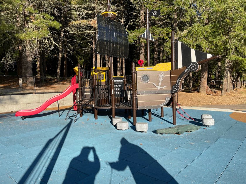 We went east from the boat ramp at the campground along a well marked trail. Along the trail is a very nice bathroom building and several tables. Also along the path was a very nicely constructed (maybe new?) pirate ship play structure.