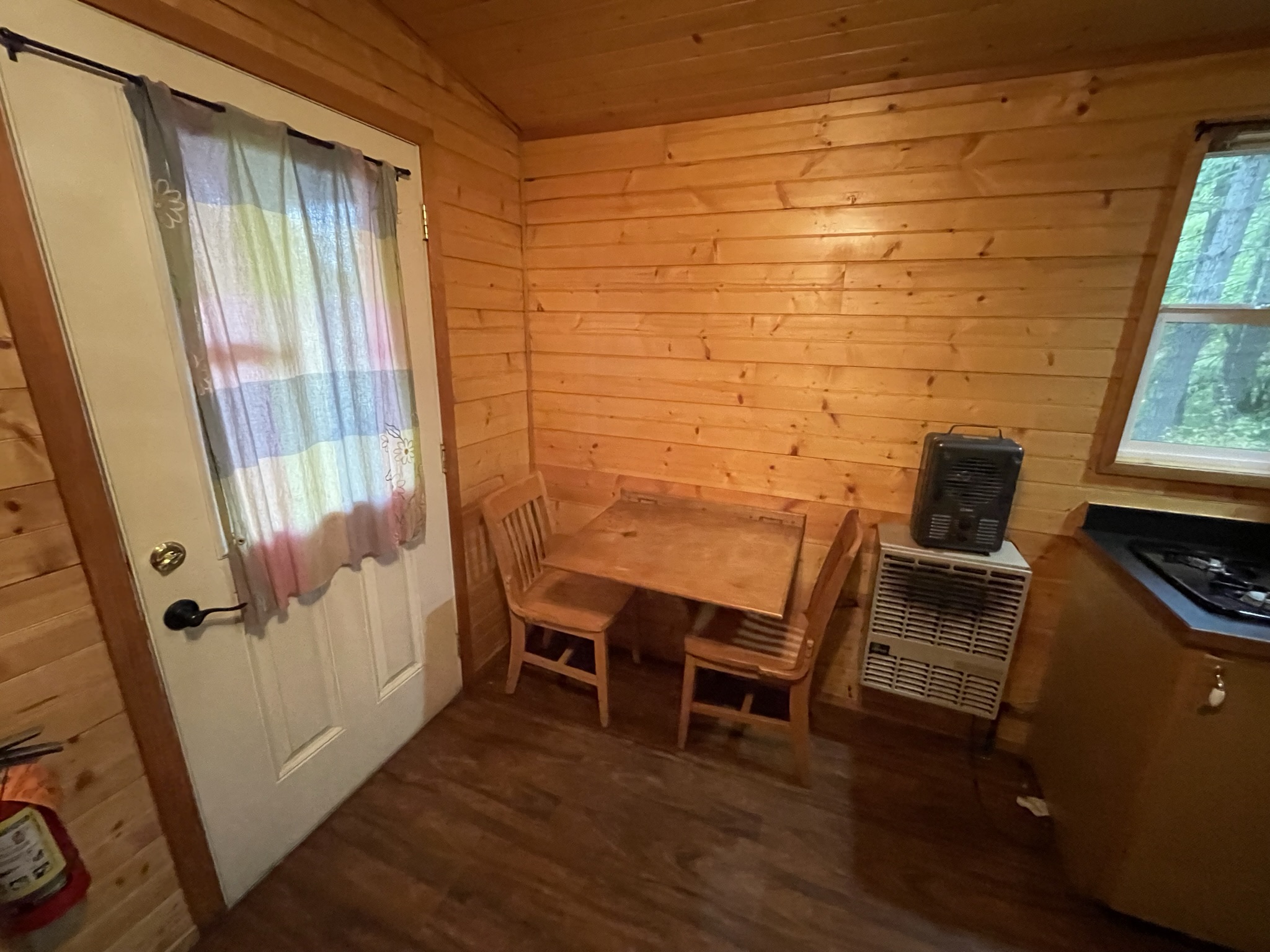 The front room in Cabin 3 is fairly small, but does contain the bed area, which is a futon, the dining area – which is a small foldable table, and 2 chairs. The room heater is between the kitchen area and the table. The hot water heater is located under the sink, and there is a small fridge under the cook-top area. Toward the back on the right is the door to the restroom.